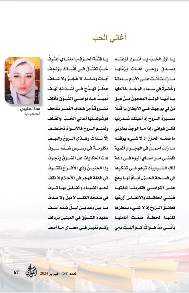 قصيدتي ( أغاني الحب ) منشورة في العدد الجديد من مجلة القوافي (54) فبراير 2024 والصادرة عن دائرة الثقافة بالشارقة ، مع جزيل الشكر للمجلة